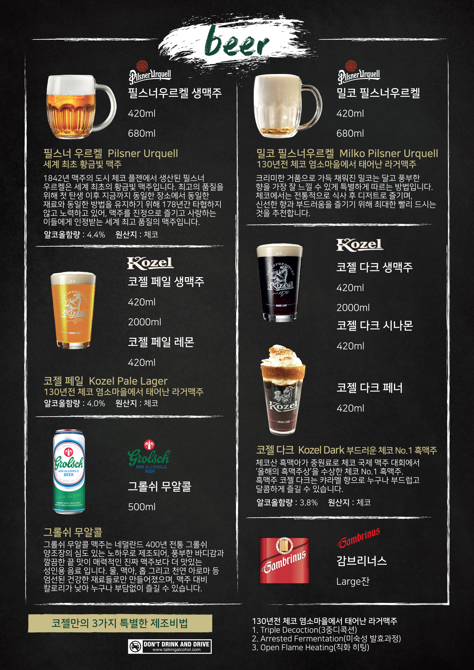필젠 지역 특유의 부드러운 물(연수)과 세계 최고 품질의 체코산 사츠홉(SAAZ HOP), 그리고 보헤미아 지역의 황금빛 보리로 제조된 필스너 우르켈은 밝고 선명한 황금빛을 띤 독창적인 풍미의 프리미엄 맥주로, 맥주를 진정으로 즐기고 사랑하는 BEER AFICINADO 들이 인정하는 세계 최고 품질의 맥주입니다. 순한 목 넘김과 깊고 강한 끝맛의 조화로움, 인공 첨가물을 넣지 않아 비타민이 살아있는 풍부한 맛, 한잔을 마시고 나면 또 한잔을 찾게 되는 필스너 우르켈만의 매력, 필스너 우르켈을 좋아하는 음식에 곁들여 즐기시길 추천합니다. 특히 기름진 육류 요리를 먹을 때 필스너 우르켈만의 깊고 강한 맛은 입안을 깔끔하게 해주고 향을 돋우는데 제격입니다.
